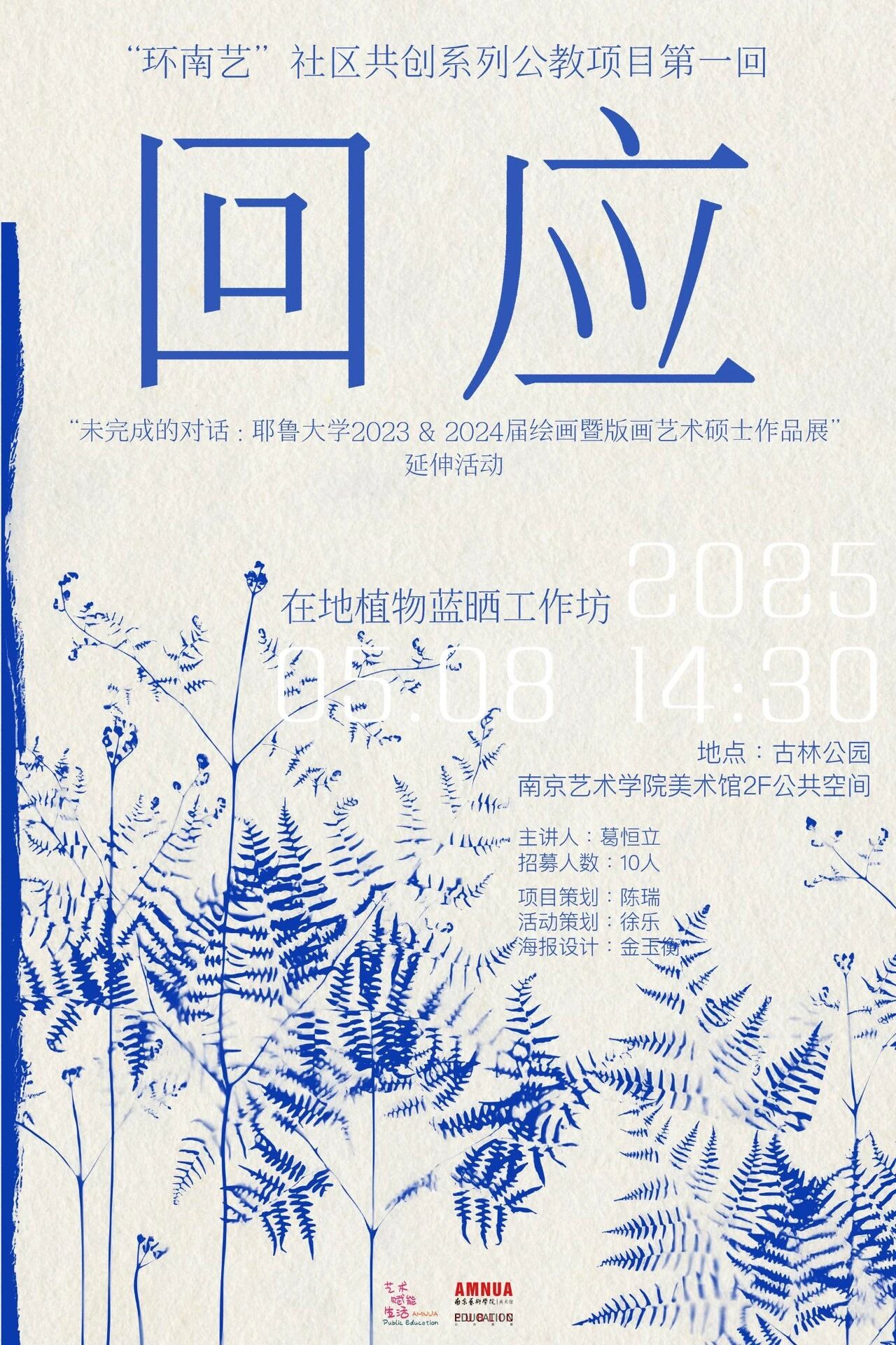 本次工作坊作为“未完成的对话”展览的延伸活动,邀请了HLiiC恒立影像中心创始人、达盖尔银版师、美国银版协会会员,南京艺术学院摄影硕士生行业导师葛恒立老师,通过蓝晒印相工艺(Cyanotype)这一历史与实验性兼具的摄影媒介,结合美术馆周边生态资源,发起以“在地植物”为主题的体验型工作坊。本次活动将以“古林公园”为采集与观察区域,围绕该地特色植被展开植物观察、工艺学习与手工制作体验,建立自然感知与艺术创作之间的多重联结,完成一次与展览未完成的对话。