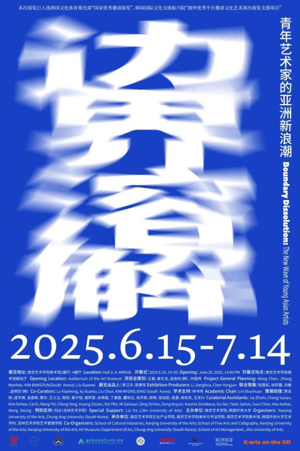 展览《边界溶解 :青年艺术家的亚洲新浪潮》于2025年6月20日下午2时在南艺美术馆报告厅隆重开幕。该展览由南京艺术学院、韩国中央大学主办,南京艺术学院文化产业学院、南京艺术学院美术与书法学院、南京艺术学院美术馆、韩国中央大学艺术学科、吉林艺术学院艺术管理学院联合承办。