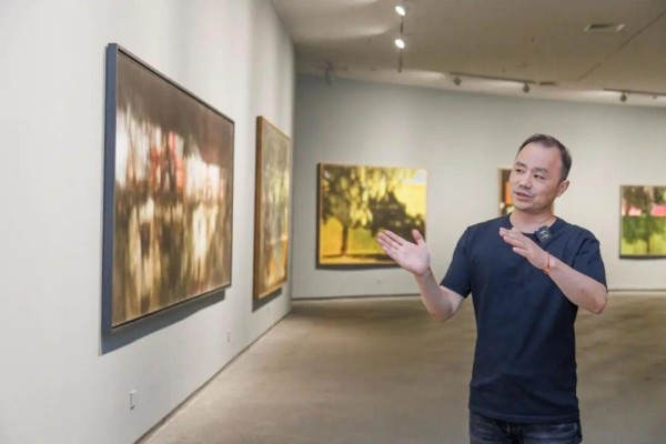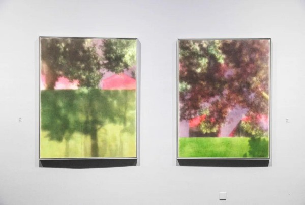 艺术家在导览中分享了对绘画的独到见解。他表示,创作多源于偶然捕捉的视觉瞬间,如夜间路灯下的树影、老房子的斑驳光斑、彩色铁皮与栅栏隔开的红色光影等,这些画面带有强烈的直觉性与生命律动。近年来,他倾向于大尺幅创作,注重远近观看的不同体验:远处形成整体氛围,近处则可见笔触与铅笔痕迹,艺术家拒绝过分唯美,主动保留画面的粗糙感,并开始使用手机拍摄带来的偶然色彩,突破以往沉郁色调,如首次运用鲜艳的玫瑰红,体现其对视觉与心理边界的持续探索。无论是即兴的黑白小幅,还是近期色彩丰富、空间模糊的大作,皆源于对“瞬间之光”的捕捉与转化,反映其从具象到抽象意味、从沉静到色彩爆发的创作道路。
