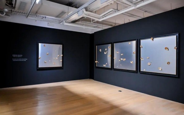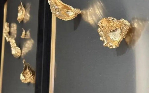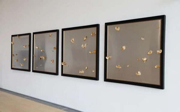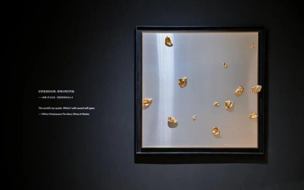 完全不同于我之前的绘画和装置作品《Poem Porn》系列作品在不断完善和延展中,金色赋予了牡蛎这种独特的个体一种崇高与神秘,镶嵌在金属板面上让原本两种坚硬的材质在光线反射中产生了抽象效果,不同于镜面金属的反射效果像燃烧的火焰似抽离的时空虫洞,是资本主义的精致浮华与虚无,这系列作品将有多元的输出与解读。