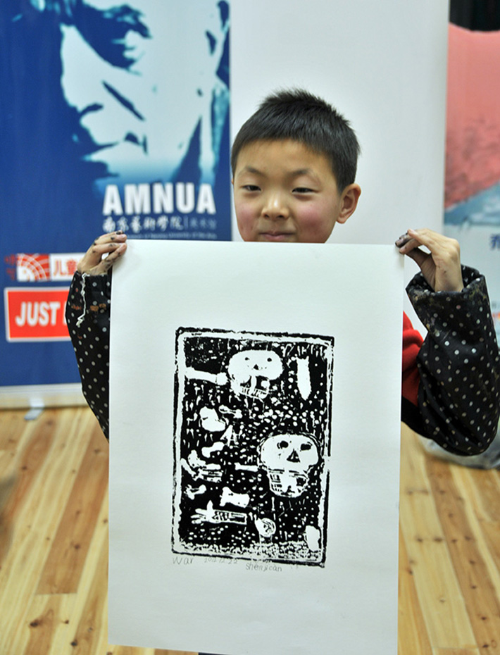 通过这次的版画创作活动,不仅让小朋友们学习到版画基本的制作过程,了解到版画这一极具表现力的艺术形式。更重要的一点是小朋友们了解到了战争对人类的影响是多么可怕,这就使得我们这一次的活动获得了额外的收获,变得更有意义了。南京艺术学院美术馆将定期举行这样的少儿公共教育活动,也欢迎更多的小朋友和家长前来参与。