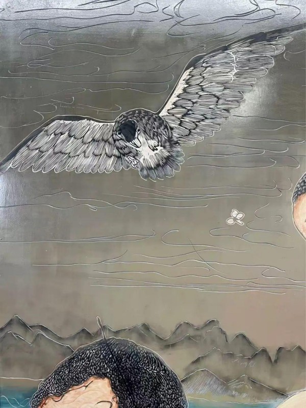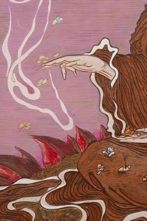 一侧的《云境》展现了具有十足想象力的壮阔画面,画面中心一男一女骑着摩托车似乎要冲出云霄、冲出画面,云层之中一个个故事接连上演,犹如石窟壁画,只不过大部分宗教元素变成了渼陂的村民、各类动物,构图也加入了更具冲击力的透视线。